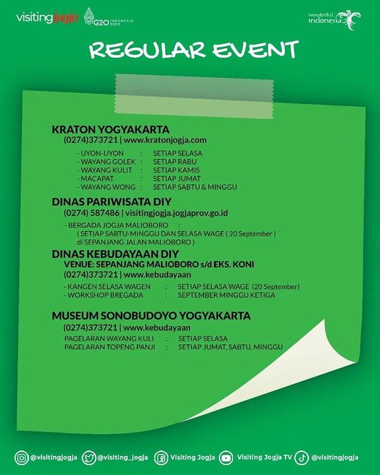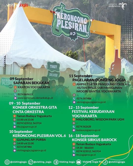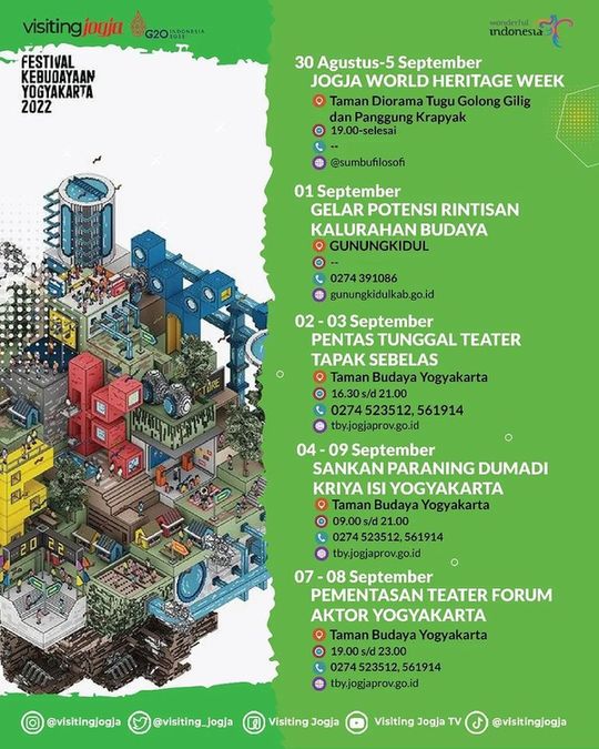 Memasuki bulan September 2022, sejumlah event digelar di DIY, berikut daftar event yang dihimpun oleh Dinas Pariwisata DIY.