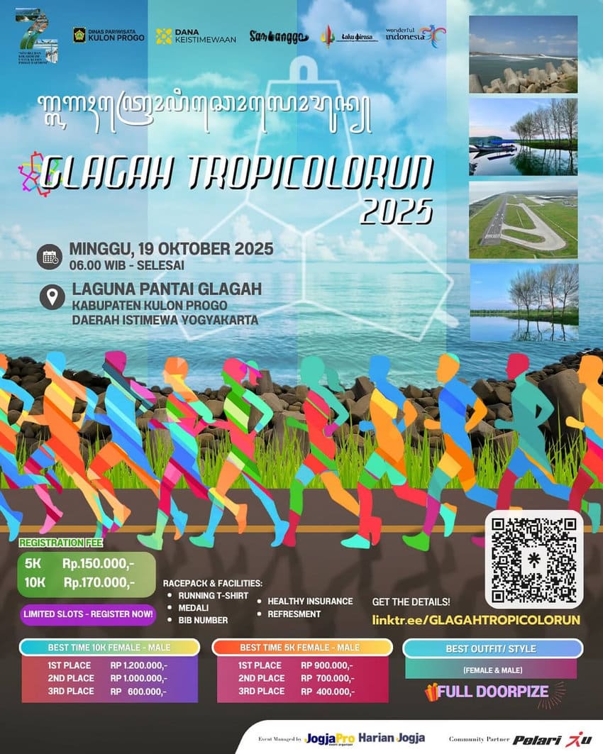 Siap-siap rasakan sensasi lari penuh warna dengan latar aerotropolis tropis dan spot-spot Instagramable di kawasan Pantai Glagah, Kulon Progo. Bukan sekadar lomba lari, tapi perpaduan sport, entertainment, dan budaya yang bikin pengalamanmu tak terlupakan!