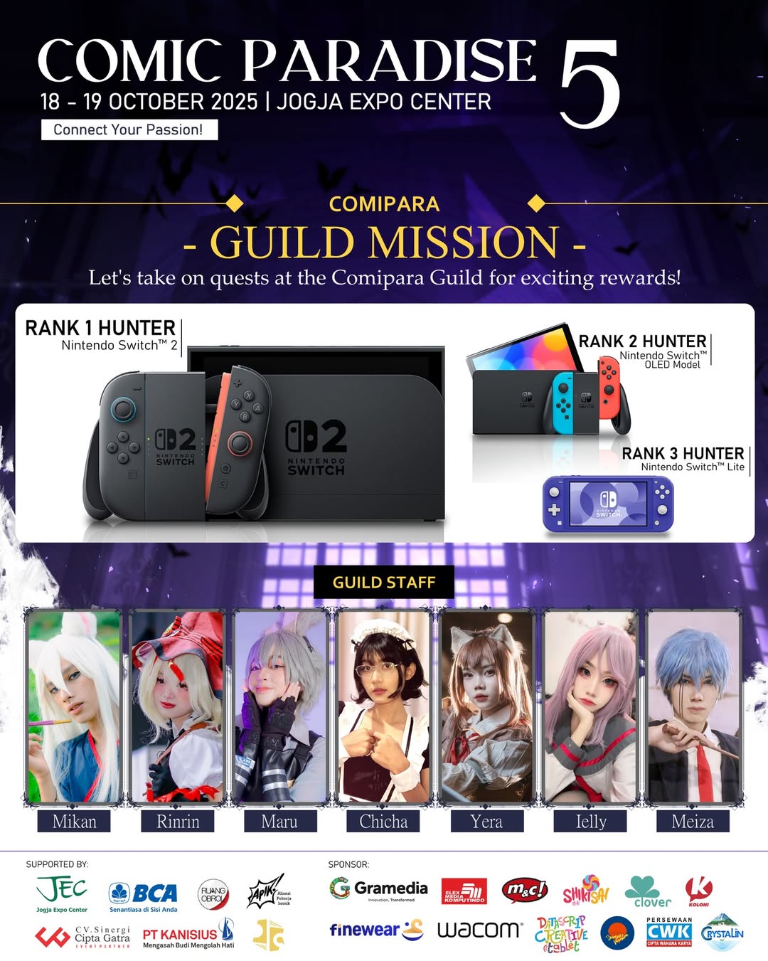 Temui lebih dari 350+ booth creator, ikuti guild mission seru, talkshow & launching komik, kompetisi kreatif, penampilan hiburan, banyak hadiah menarik, dan zona komunitas spesial!