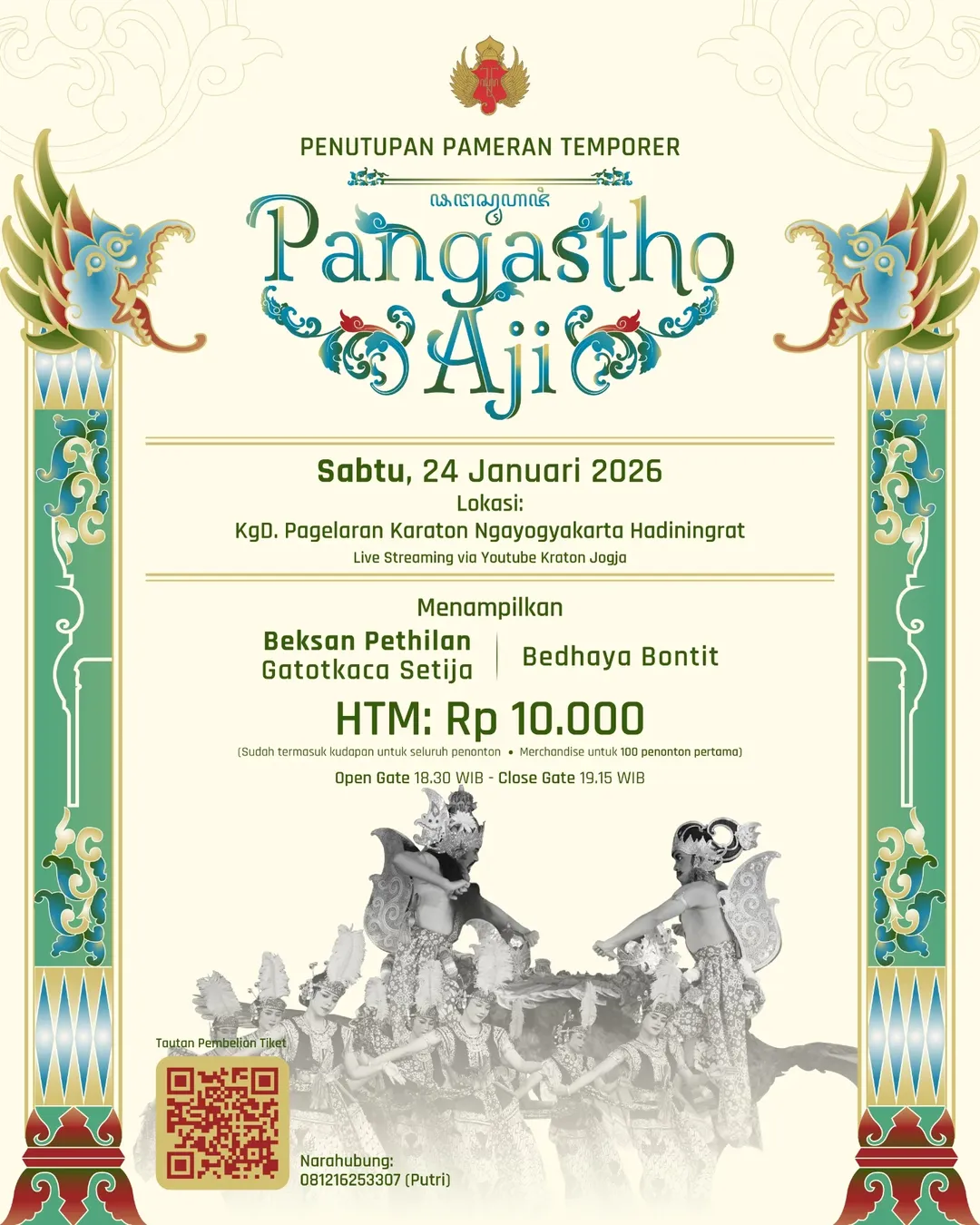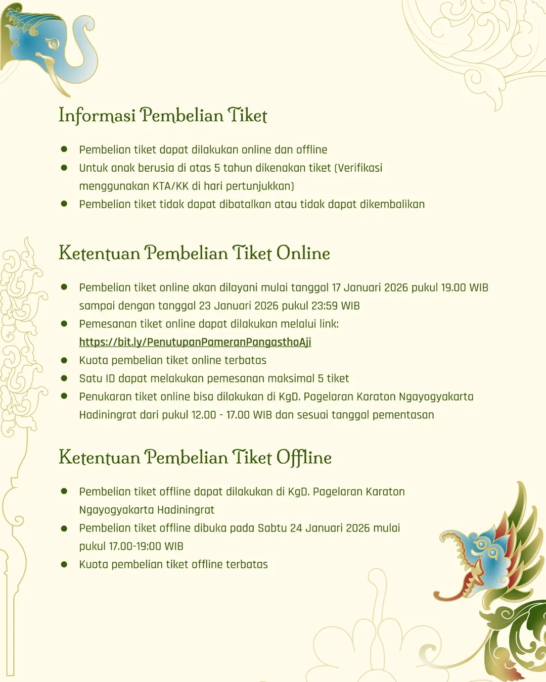 Pembelian tiket dapat dilakukan secara online malalui tautan bit.ly/PenutupanPameranPangasthoAji mulai Sabtu, 17 Januari 2026 pukul 20.00 WIB