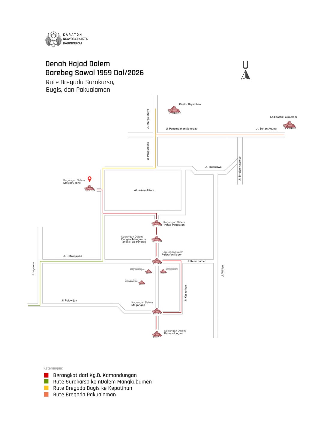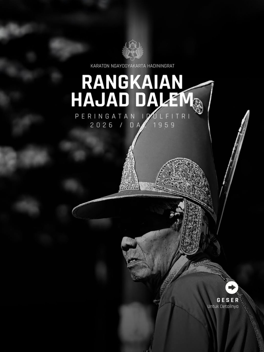 Sahabat, Keraton Yogyakarta akan melaksanakan Rangkaian Hajad Dalem Peringatan Idulfitri 2026/Dal 1959. Agenda akan diawali dengan Gladhi Resik Bregada Prajurit pengawal Garebeg Sawal pada Sabtu (14/03) sore di Kagungan Dalem Kamandungan Kidul – Alun-alun Kidul dan ditutup dengan pelaksanaan Ngabekten Putri pada Sabtu (21/04) yang akan disiarkan melalui kanal-kanal media sosial Kraton Jogja.
