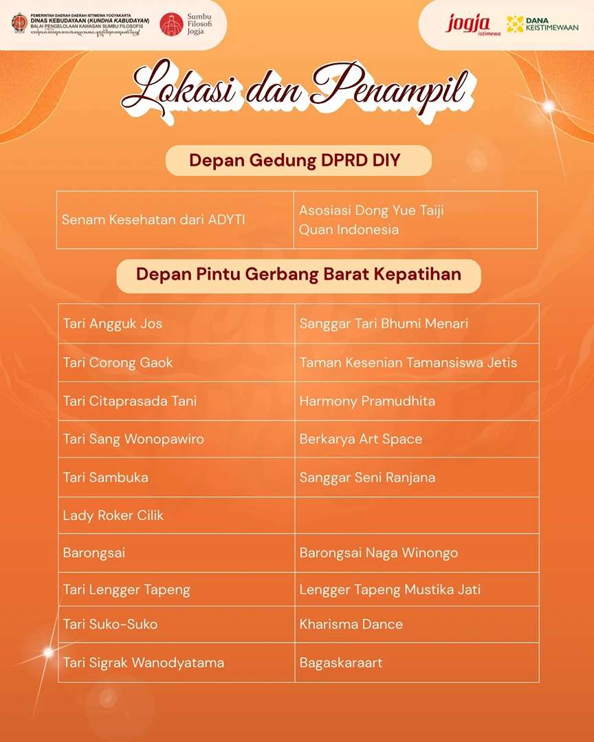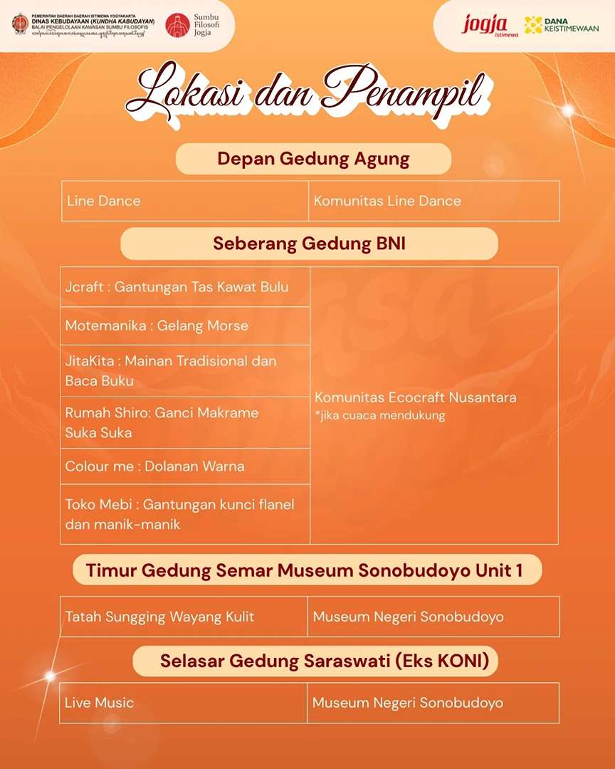 Berlangsung di kawasan Sumbu Filosofi Yogyakarta, pergelaran ini menjadi ruang hidup bagi seni, budaya, dan kreativitas yang menyatu dengan denyut kehidupan kota. Beragam pertunjukan seni tradisi hingga kreasi kontemporer siap menghadirkan suasana Sumbu Filosofi yang semakin semarak dan penuh makna. 🎭🎶