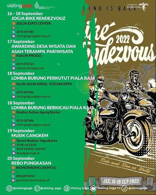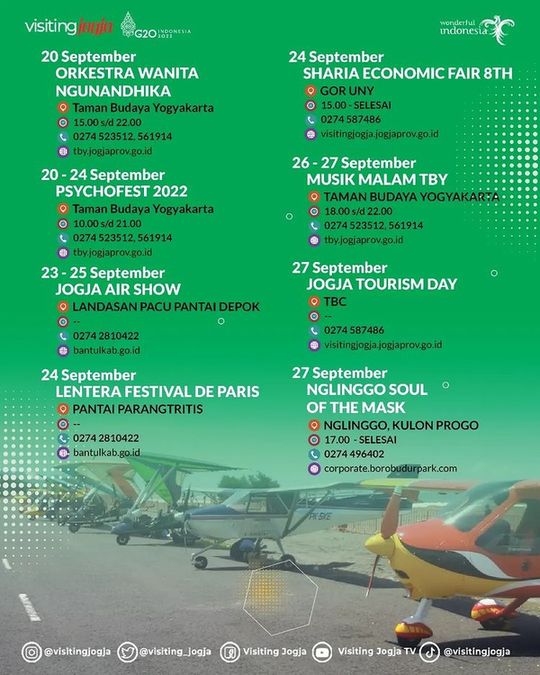 Memasuki bulan September 2022, sejumlah event digelar di DIY, berikut daftar event yang dihimpun oleh Dinas Pariwisata DIY.