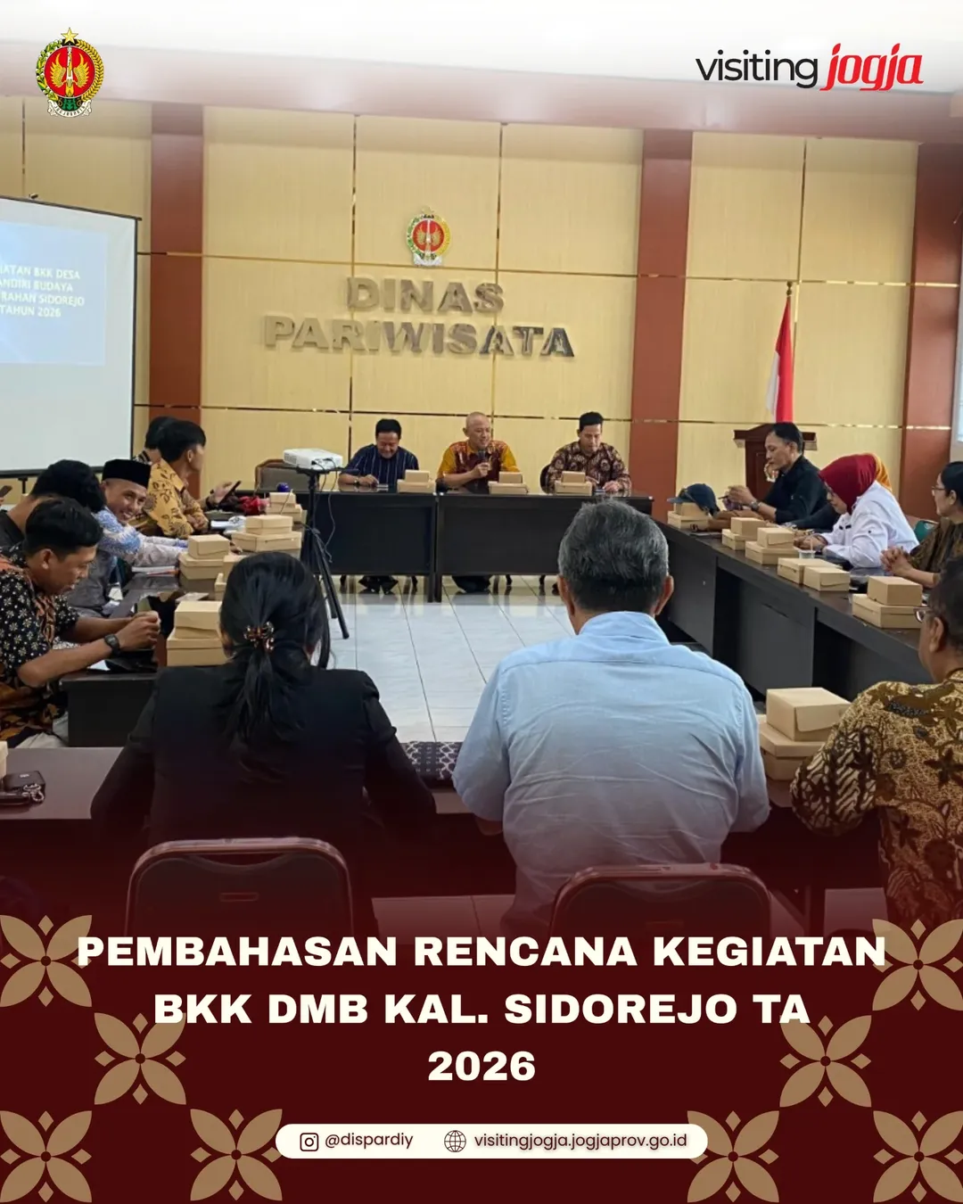 Dinas Pariwisata Daerah Istimewa Yogyakarta menggelar rapat pembahasan rencana pelaksanaan Bantuan Keuangan Khusus (BKK) Desa Mandiri Budaya (DMB) Kalurahan Sidorejo Tahun Anggaran 2026. Kegiatan berlangsung di Aula Sapta Pesona Dispar DIY, Kamis (25/9/2025), dengan melibatkan DPD Gabungan Industri Pariwisata Indonesia (GIPI) DIY sebagai mitra strategis.