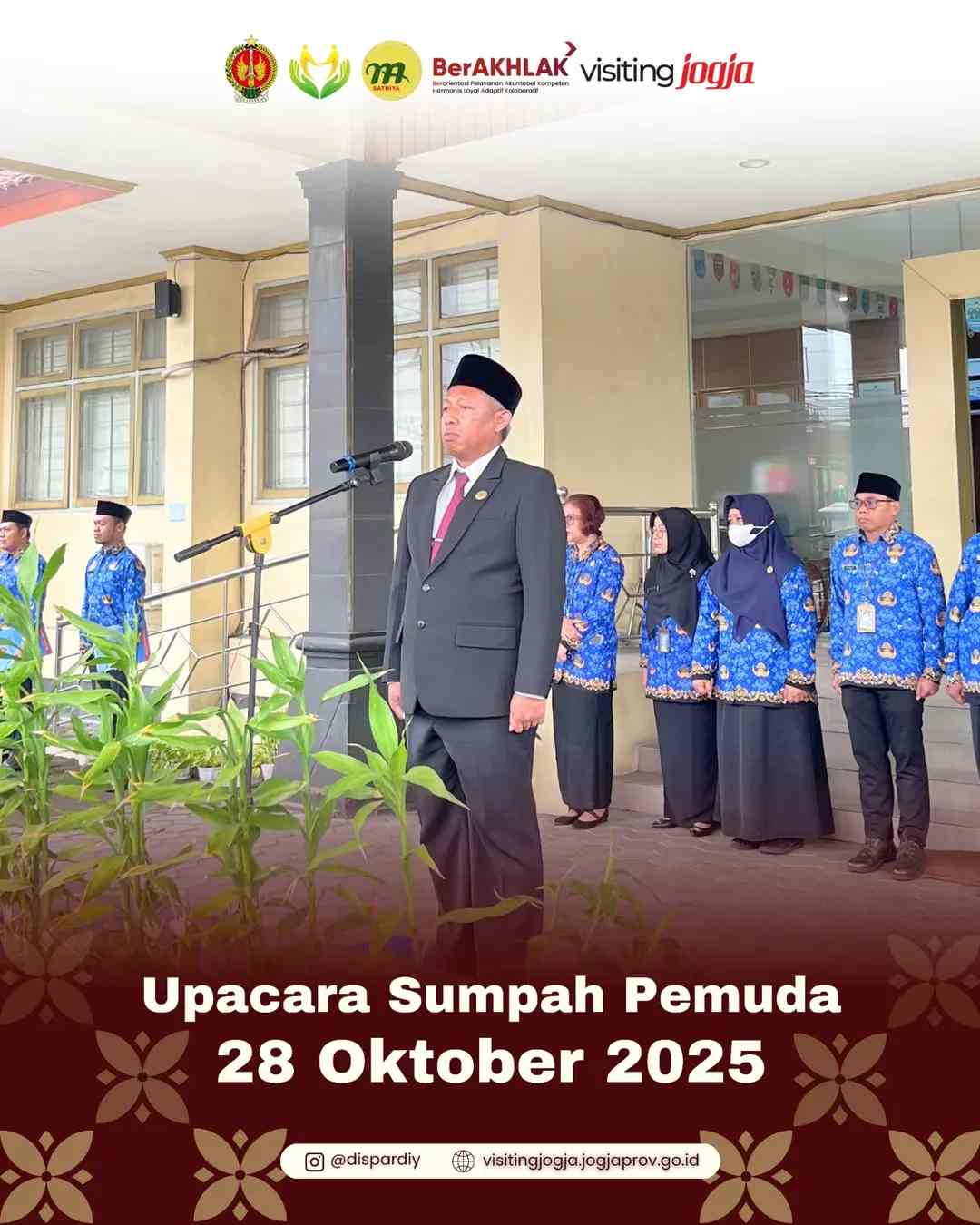 Dinas Pariwisata DIY bersama Dinas Penanaman Modal dan Pelayanan Terpadu Satu Pintu (DPMPTSP) DIY melaksanakan Upacara Peringatan Sumpah Pemuda ke-97 pada Selasa (28/10/2025). Upacara berjalan dengan khidmat dan penuh makna, dipimpin langsung oleh Sekretaris DPMPTSP DIY, Catur Cahya Nurseta, serta diikuti oleh seluruh pegawai kedua instansi.