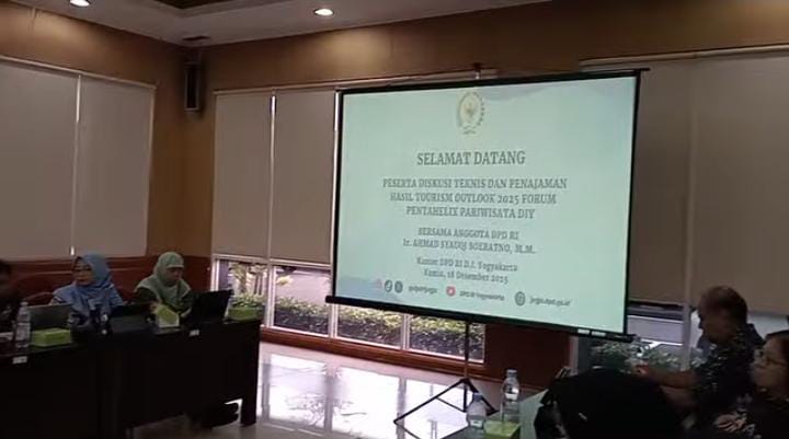 Dinas Pariwisata Daerah Istimewa Yogyakarta melaksanakan Diskusi Teknis dan Penajaman Hasil Tourism Outlook 2025 melalui Forum Pentahelix Pariwisata DIY yang diselenggarakan di Gedung DPD RI pada 18 Desember 2025. Kegiatan ini merupakan bagian dari reses penyerapan aspirasi masyarakat Masa Sidang II Tahun Sidang 2025–2026 dan dihadiri oleh Anggota Komite III DPD RI,Ahmad Syauqi Soeratno, Kepala Dinas Pariwisata DIY Imam Pratanadi beserta jajaran, perwakilan OPD di lingkungan Pemerintah Daerah DIY dan kabupaten/kota, Badan Otorita Borobudur (BOB), asosiasi pariwisata, serta media.