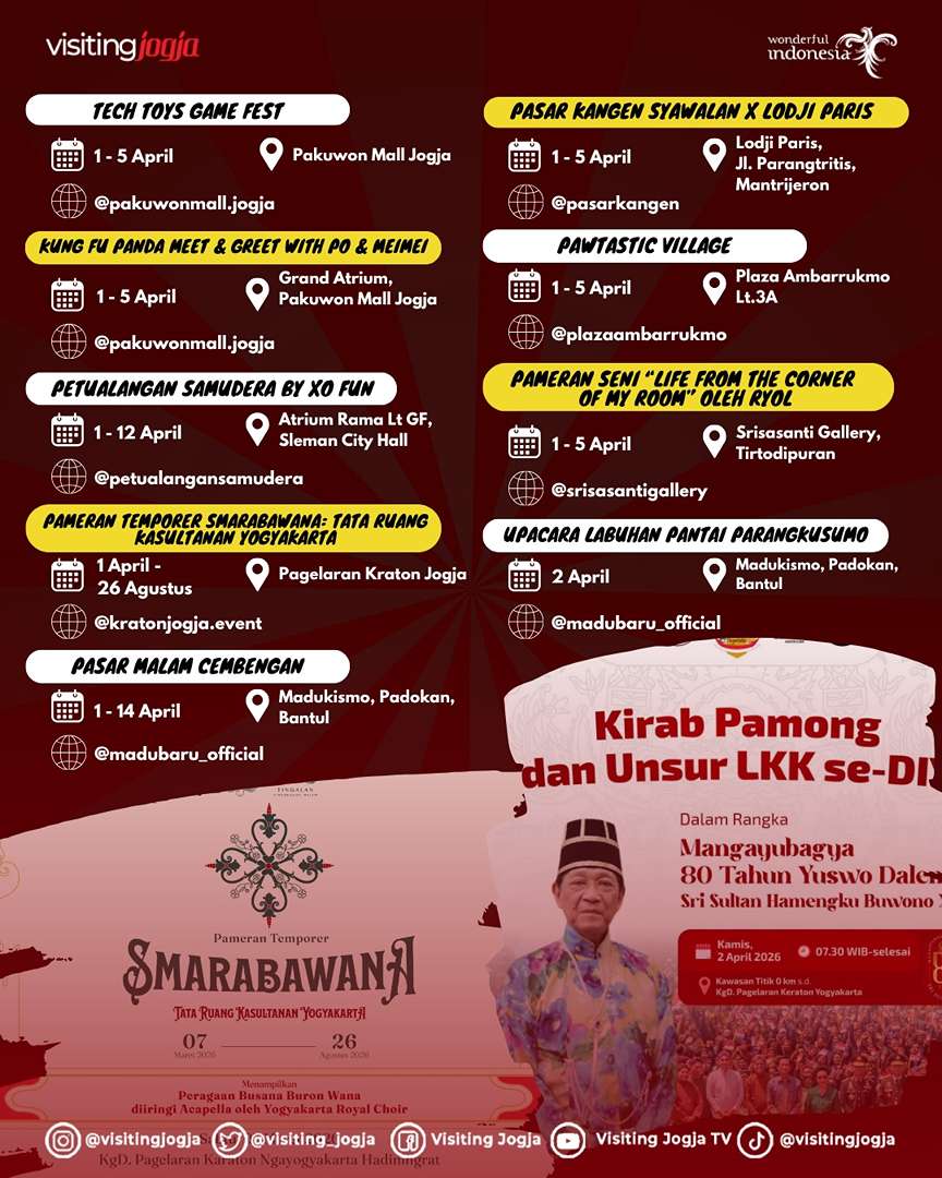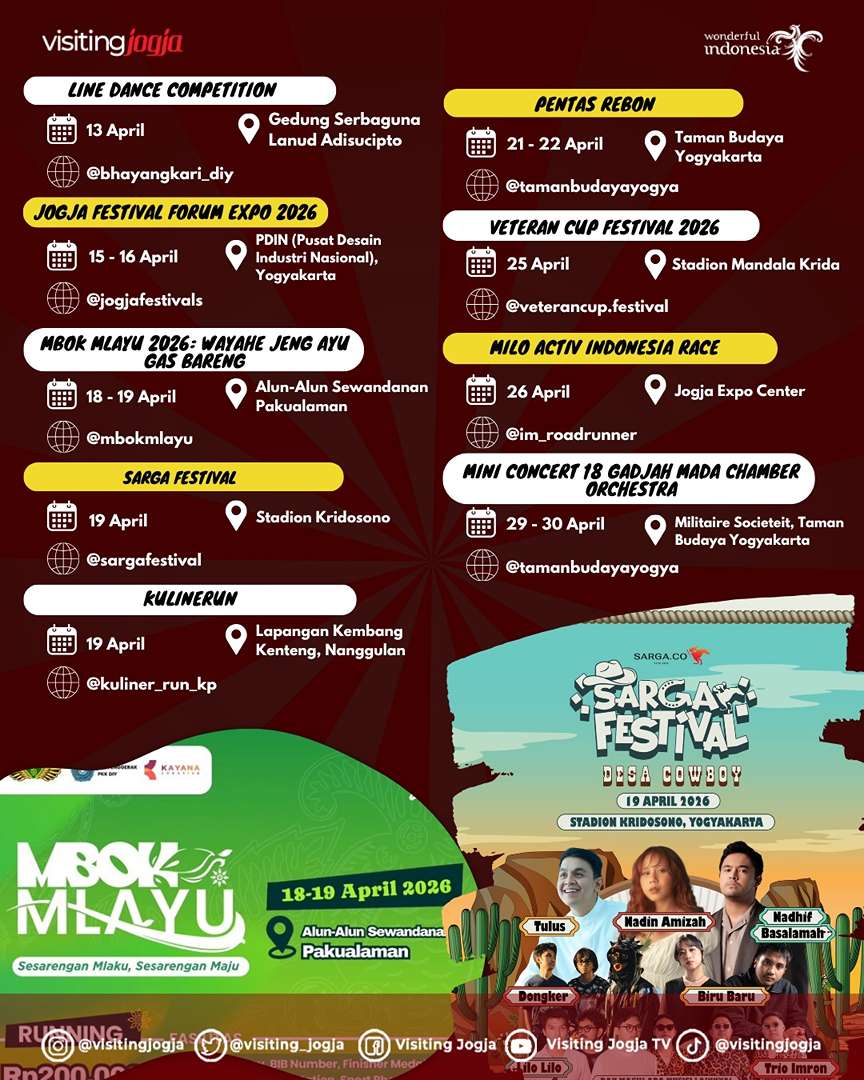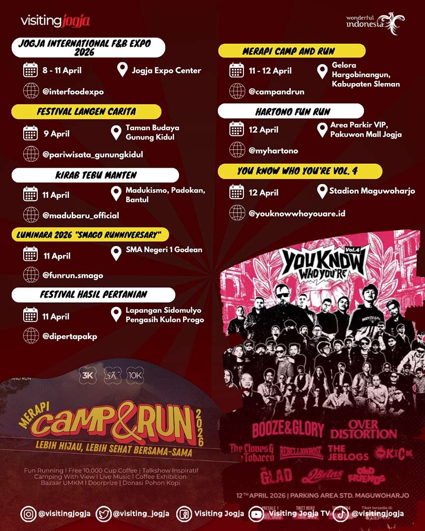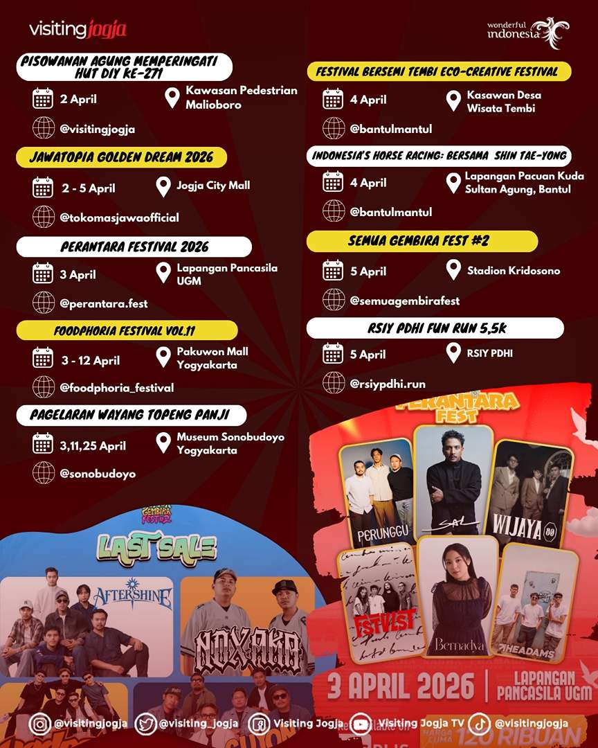 Yuk, catat tanggalnya dan rencanakan agendamu dari sekarang! Ajak keluarga, sahabat, atau pasangan untuk merasakan langsung atmosfer event di Jogja yang selalu istimewa. Jangan lupa swipe postingan ini untuk melihat daftar event yang bisa kamu kunjungi selama bulan April.